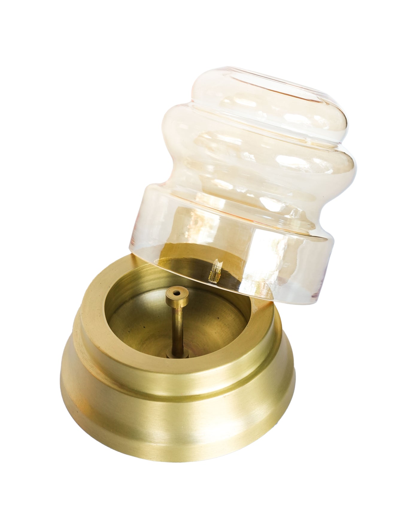 Gracefully crafted with a sturdy brass base and a clear glass chamber, this diya brings quiet sophistication to your sacred space. Its thoughtful design ensures the flame burns steadily for hours, making it ideal for extended prayers, rituals, or simply creating a peaceful atmosphere.